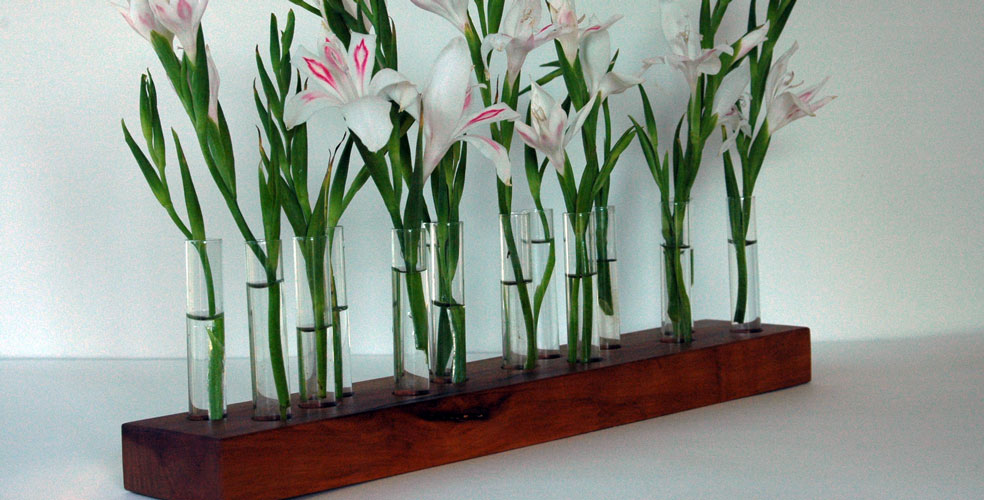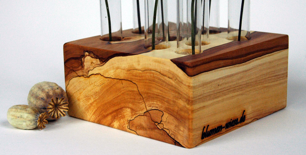 This model variation is in different forms und woods available. The test tube vases can be round angled, long with or without bark. Everything is possible.